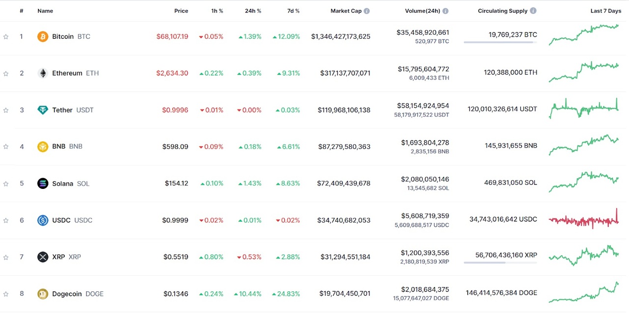 Az elmúlt hetet tekintve a Bitcoin, az Ethereum és a Solana is szépen emelkedtek. A BTC 12,09%-kal, az ETH 9,31%-kal, a SOL pedig 8,63%-kal növekedett, de a DOGE különösen belehúzott a 24,83% feletti növekedésével.