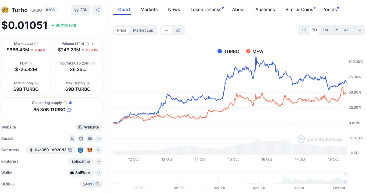 Az egyik legjobban teljesítő top érme az elmúlt héten a TURBO volt 66,11%-os növekedéssel, péntek délelőtt 0.01051 dolláron áll.