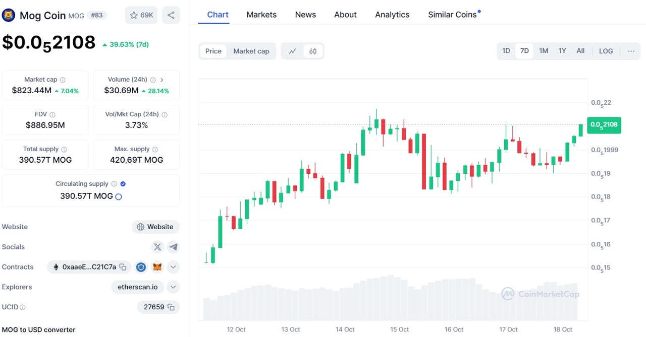 A nagy érmék közül az elmúlt hét nap során leginkább a Mog Coin, a cat in a dogs world és Turbo emelkedett.