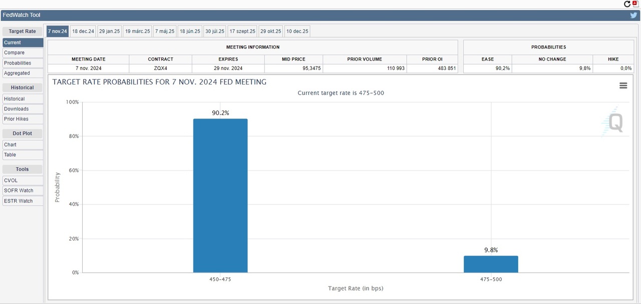 Aztán vegyük figyelembe a Fed következő, november 7-re eső FOMC ülését, mely esetében per pillanat 90,2% esély van egy újabb kamatcsökkentésre. Ez a hír nagyon édesen hangzik a kriptokereskedők számára.