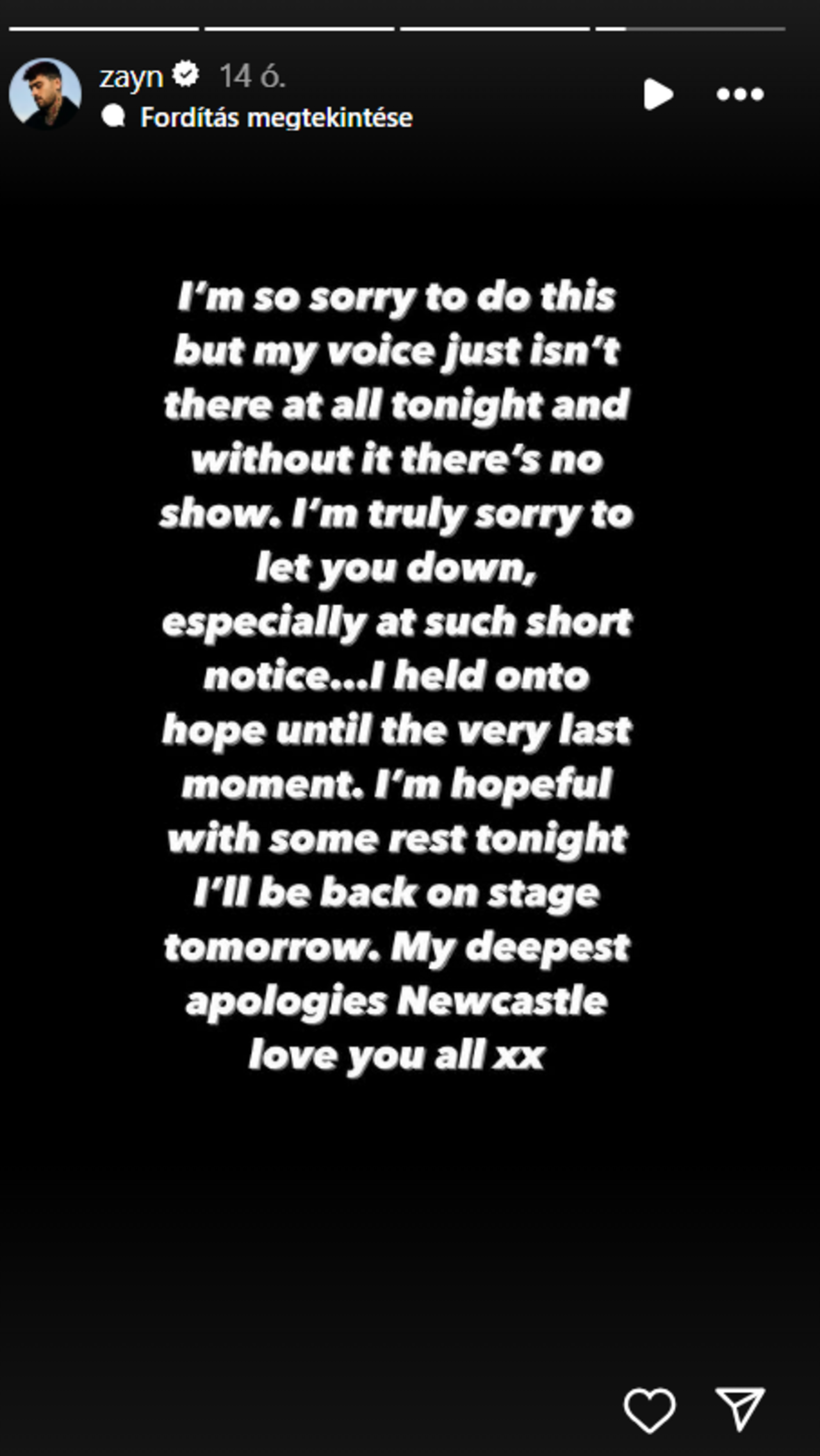 hirdetésZayn Malik december 3-án Newcastle-ben adott volna koncertet, ám a 31 éves énekes percekkel a kezdés előtt lemondta a fellépést. Zayn állítólag azért nem értesítette a rá váró közönséget hamarabb, mert saját bevallása szerint abban reménykedett, hogy mégis színpadra tud lépni – természetesen a jegyek árát visszatérítik a hoppon maradt fanatikusoknak.