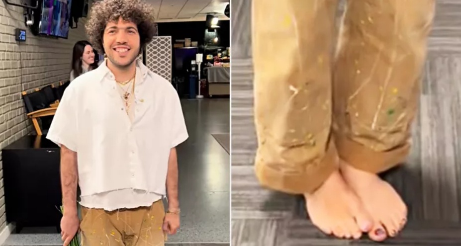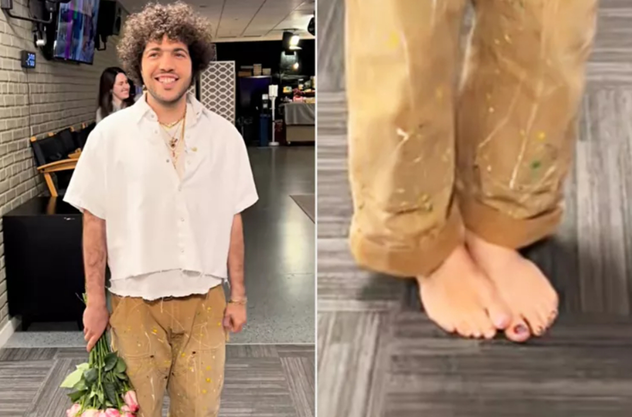 Benny Blanco cipő nélkül, színesre festett lábkörmökkel jelent meg egy műsorban