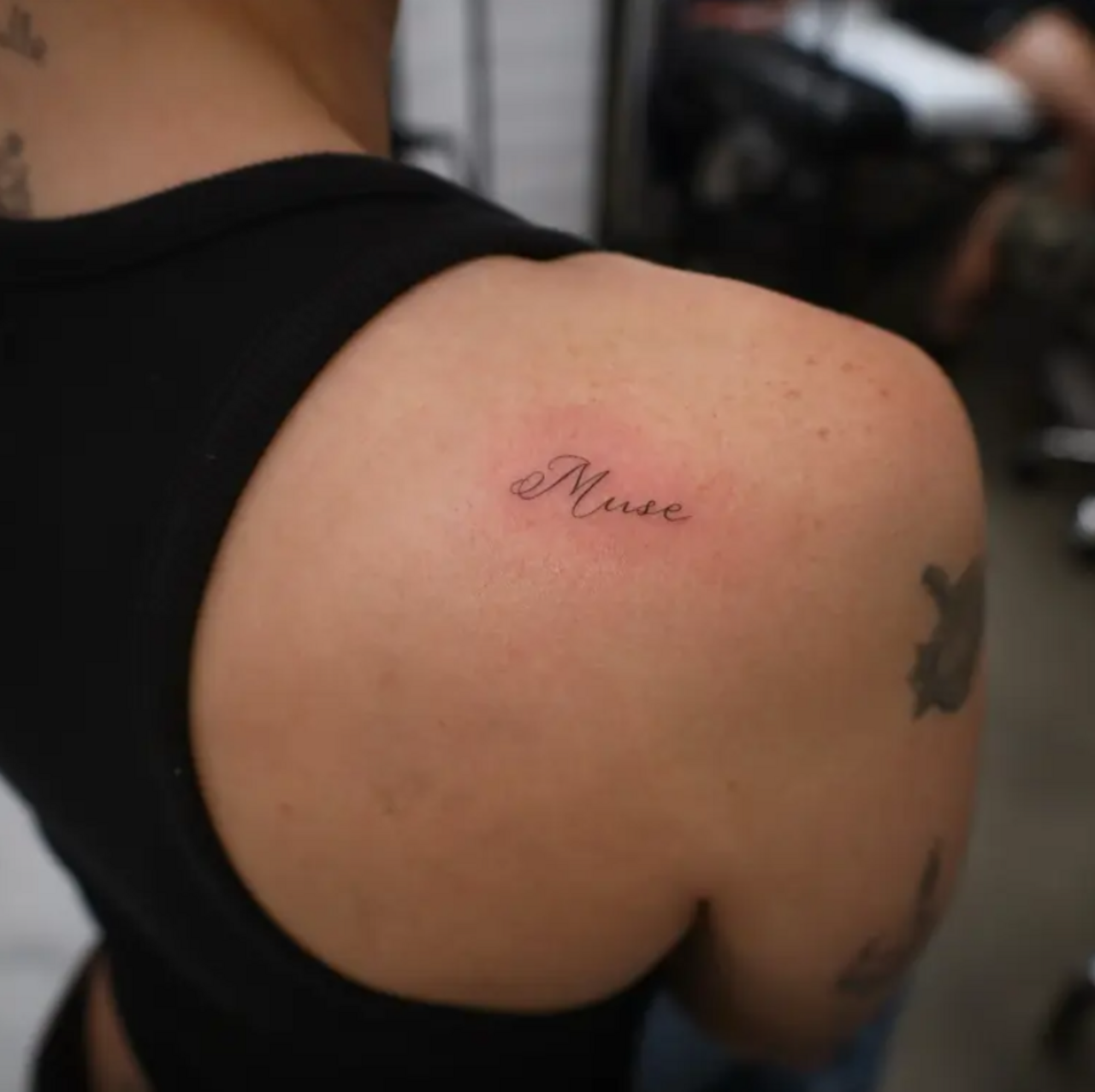 Muse, azaz múzsa – ez a felirat kapott helyet Miley jobb válla alatt. Az énekesnő állítólag ezzel a szóval édesanyja, Tish Cyrus előtt tiszteleg.