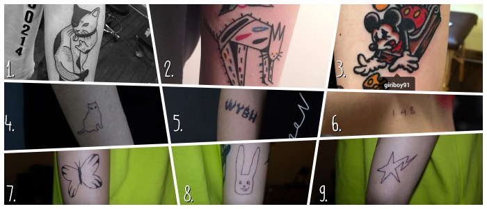 1. 2017-ben készült el második tetoválása, egy macska, ami kutyakonzerven ül. | 2. 2015-ben készült el az első tetoválása, ami Picasso stílusban ábrázol egy macskát. | 3. 2016-ban készült a Mickey egeret ábrázoló. | 4-5. 2017-ben készült mind a két tetoválása, előbbi egy macskát ábrázol, míg utóbbi a WYBH rövidítést. A WYBH (WooJooBiHaeng, ami űrrepülést jelent) egy művész kollektíva. Giriboy alapította 2016-ban. | 6. Szintén 2017-ben varratta magára a 148-as számkombinációt. Giriboy álmában leejtette a One Piece manga 148. számát és hiába próbálta elkapni, nem sikerült neki. Valósnak érezte az álmot. Majd másnap DJ SQ nyert egy díjat a 148-as számmal. Szintén 148-nak nevezte el a saját ruhakollekcióját. | 7-8-9. 2020-ban az alábbi három tetoválás mellett döntött.